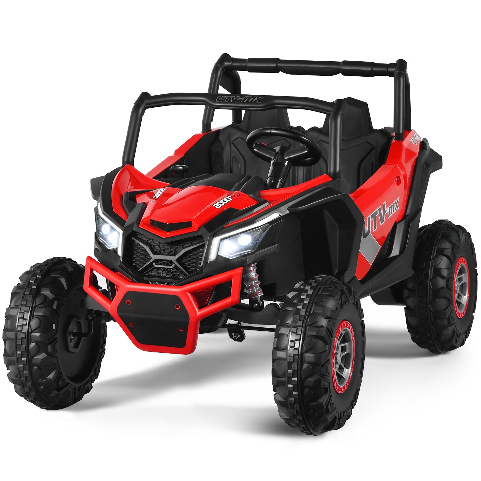 Offer your kids realistic driving mini UTV cars with multiple media features. This two-door car has rear trunk storage, horn, front and tail lights. What makes driving even more fun are the built-in music, FM and story features. The 2.4g remote provides security and control priorities for parents, with three speeds and a brake button. Steering wheel and pedals (2 speed) also allow kids to move the car on their own, exploring the controls and driving fun.Color:Red