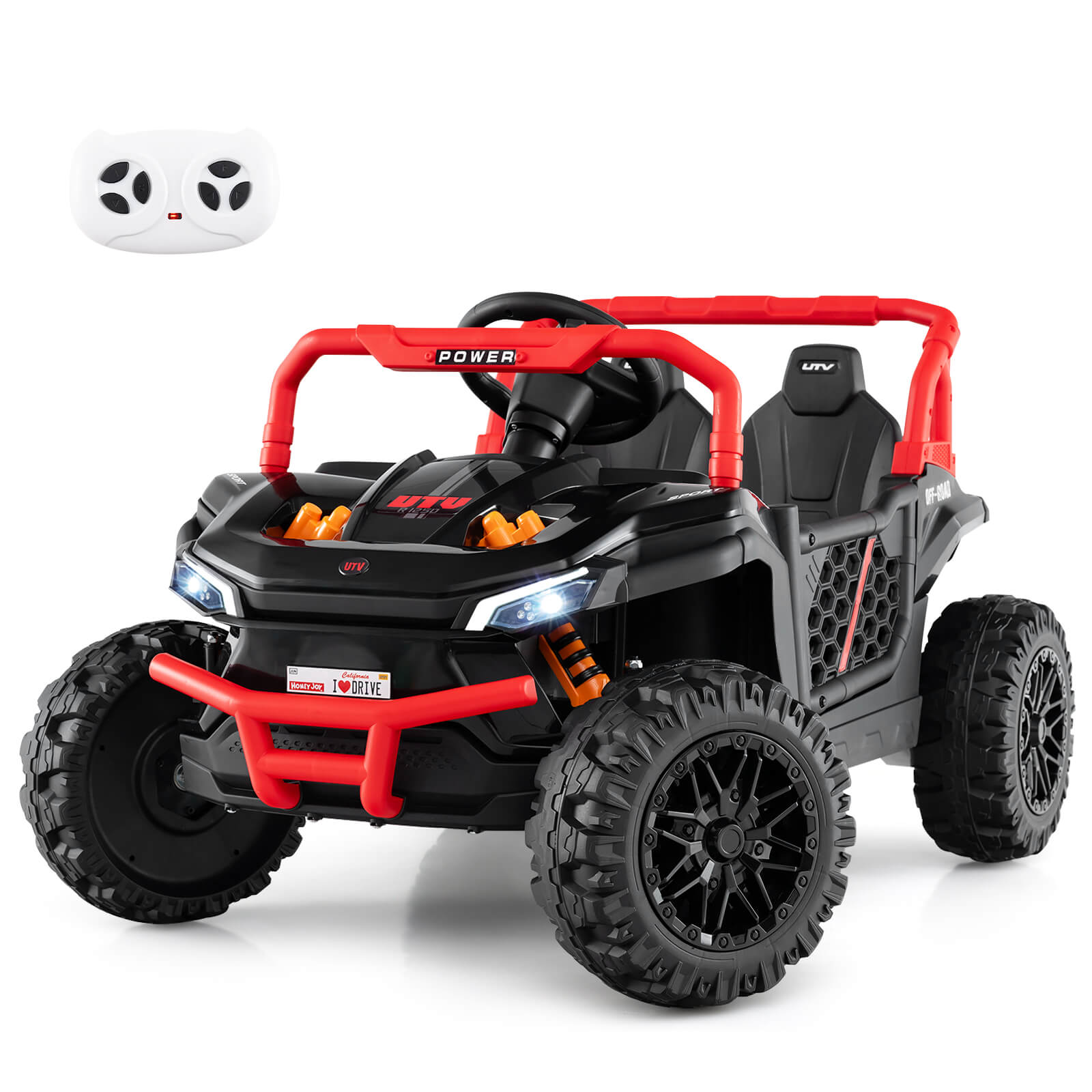 Our 12V kids' off-road vehicle is equipped with a powerful battery and 2 motors for a realistic driving experience for kids. Wireless connectivity, USB and MIC ports bring more entertainment options. Children can drive the car independently at 2 speeds, while parents can also use the remote control to control the car at 3 speeds. Safety is a top priority, with lockable doors and seat belts included in the design. This electric off-road vehicle has metal spring shock absorbers on each wheel to ensure smooth driving on different types of terrain. The electric car comes with a built-in speaker, music and LED lights to add fun for the little driver. In addition, the slow start and stop function helps prevent sudden movements from scaring the child.Color: Black + Red