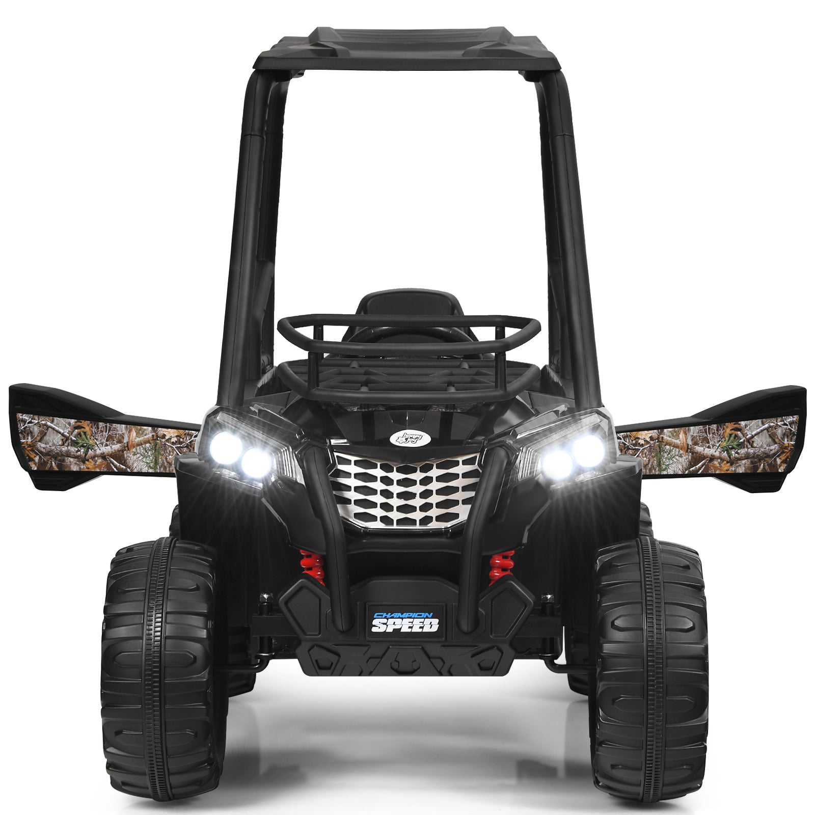 This off- UTV truck is exactly what you want, and it's also worth mentioning that the ride truck comes with dual mode. Equipped with LED lights, pedals, and steering wheel, riding in the truck provides a realistic driving experience for children. Parents can control the car freely using a 2.4ghz remote control. In battery-operated mode, children can drive the car and enjoy a realistic driving experience. No worries about reliability. The spring suspension system absorbs and minimizes impact, providing a smooth ride. Kids are sure to fall in love with its cool and chic design.Color: Black