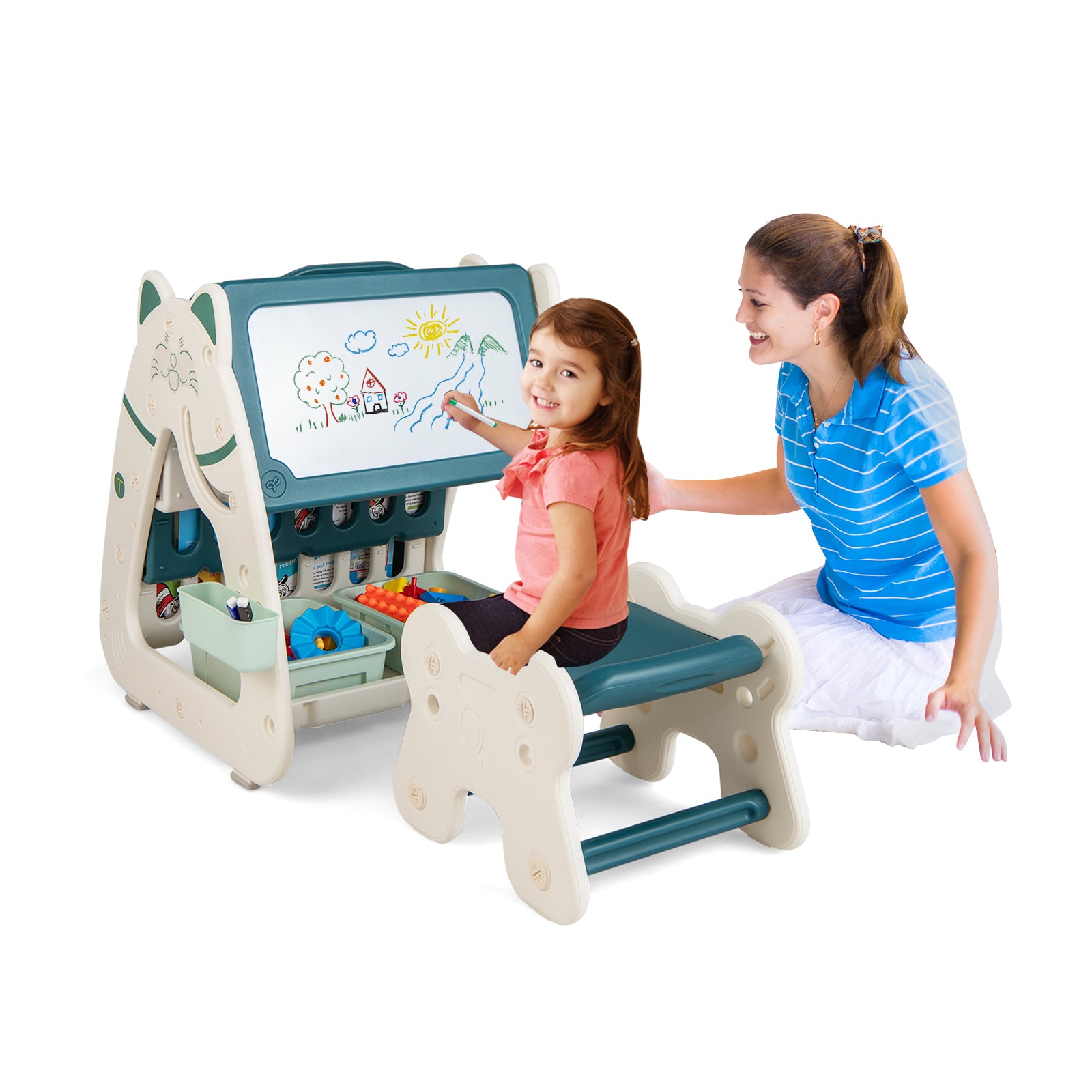 This 3-in-1 Art Easel is Children's Art Easel and stool set made of child-friendly PE material that is burr free and tasteless to meet the safety concerns of children. For young artists, four colored markers and a magnetic eraser are provided. In addition, 4 shelves, 2 storage baskets and 1 pen holder keep your child's books and art supplies organized. What's more, the A-shaped structure and non-slip silicone pads make the upright easel more stable. A mom never worries about a messy child's room. Children can sit comfortably on stools for hours of fun.Color: Green+ White