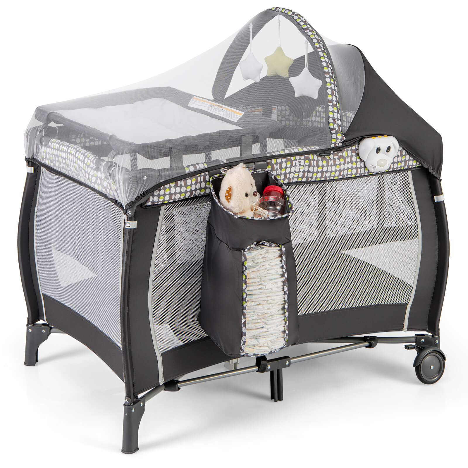 This versatile playbed can be used as a crib, bassinet, diaper table and activity center. With 2 lockable wheels, it is easier to move between rooms. For easy storage and transportation, this travel-friendly baby cradle can be folded into a compact size and stored in the included tote bag. Diaper table and netting awning can be removed as needed. The package includes a soft mattress, hanging toys and a music box.Color: Dark Gray