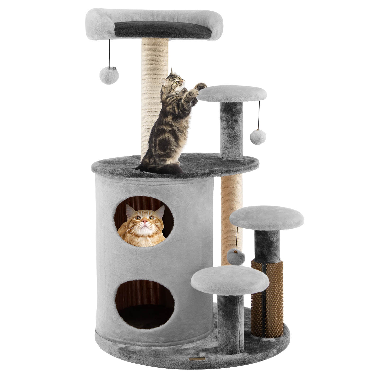 Choose our multi-purpose cat tree and place it in your home, it is sure to delight kittens! Made of durable particleboard and a reinforced circular base, the multistory cat tower is stable and reliable, allowing cats to jump up and down. Perfect for cat scratching, climbing, exercise; There are also jingling fur balls and cat brushes for your pets to play with. 2 spacious cat apartments and 1 sturdy perch provide a comfortable nap experience for more cats.Color: Grey