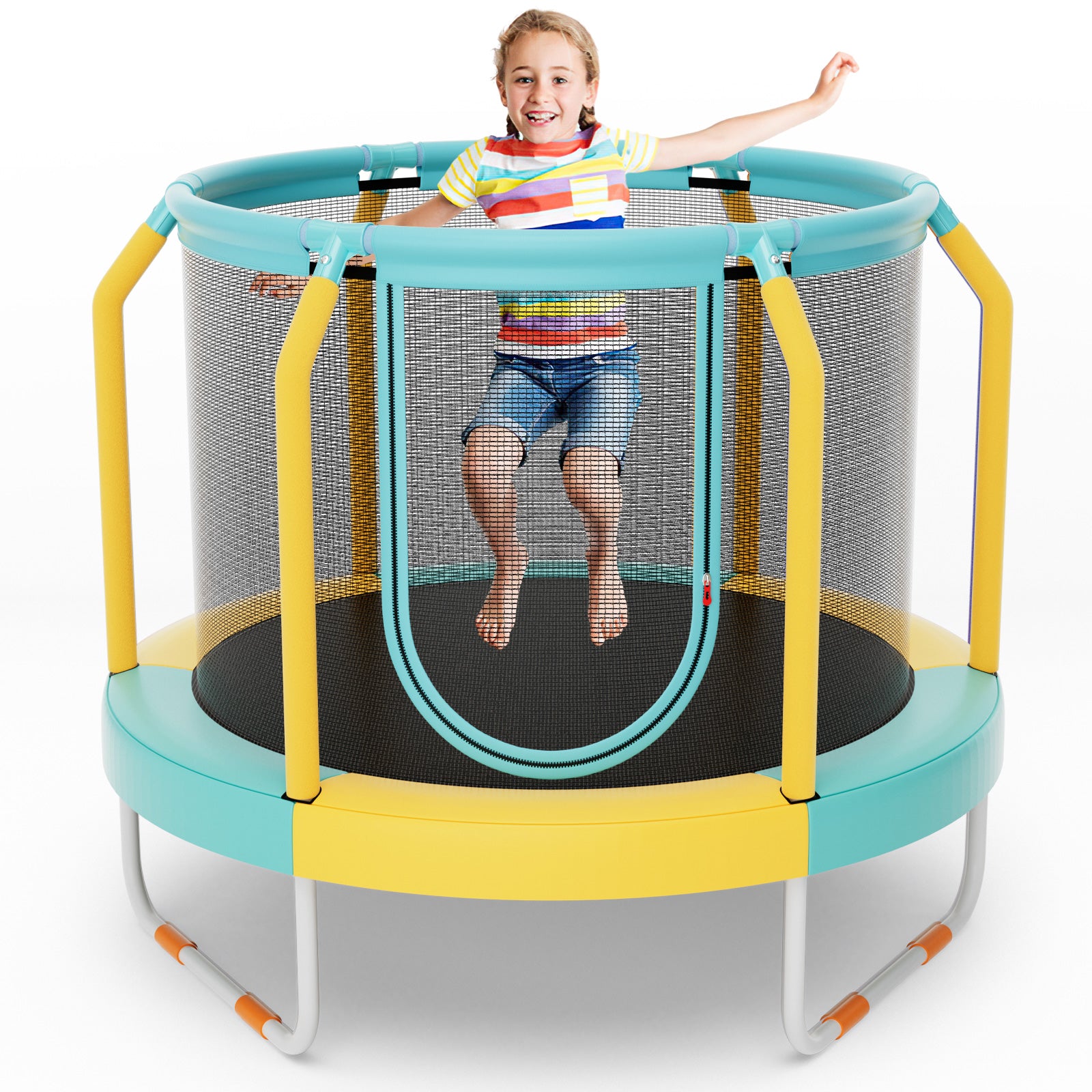 Our trampoline for children is supported by heavy metal tubes and is very stable. The exterior zipper and seamless design also create a safe environment for your child. The foam-filled poles are kept away from the fence netting, which allows the child to jump without bumping the poles. In addition, the top rail layer and jump pad enhance the overall stability. High bounce MATS and bungee jumps provide an unparalleled bounce experience for young children.Color: Blue + Yellow