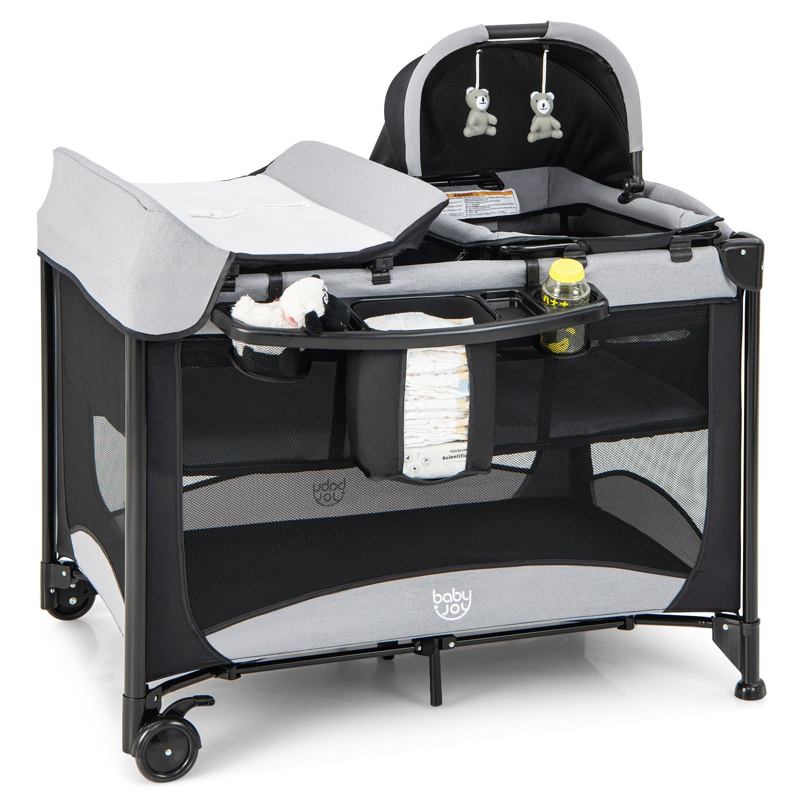 This baby care center has 5 modes of use, including crib, crib, crib, activity center and changing table. When not in use, the crib folds into an accompanying tote bag.Color: Black + Grey