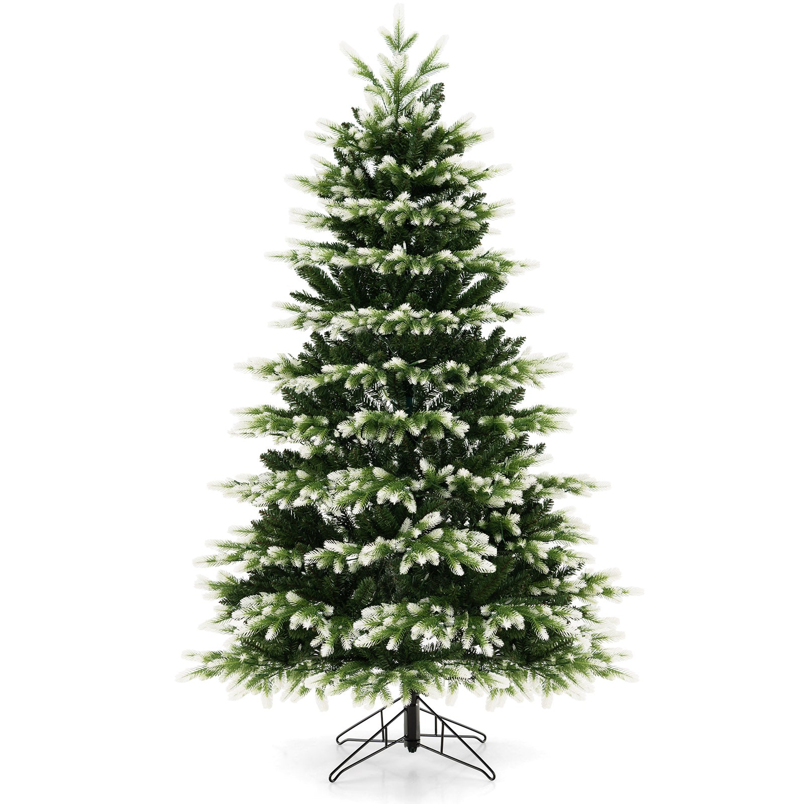 Made of 100% new PE and PVC, this 6-foot tree offers excellent fire, allergy and fade resistance, ensuring its longevity as a beloved holiday centerpiece. With up to 1,801 tree tips, the lifelike branches transition from lush green to snowy white, capturing the true beauty of the snowy landscape. Prepare to be mesmerized by 350 teardrop-shaped LED lights that glow warm white or cool white. The upgraded folded metal bracket not only adds stability, but also protects the floor through its round legs. With three dynamic lighting modes, including A on, B on, and A/B color changing lighting, you can create a charming atmosphere that will enchant all viewers. Say goodbye to tangled wires and simplify setup with our fast power connectors.Color: Green & White