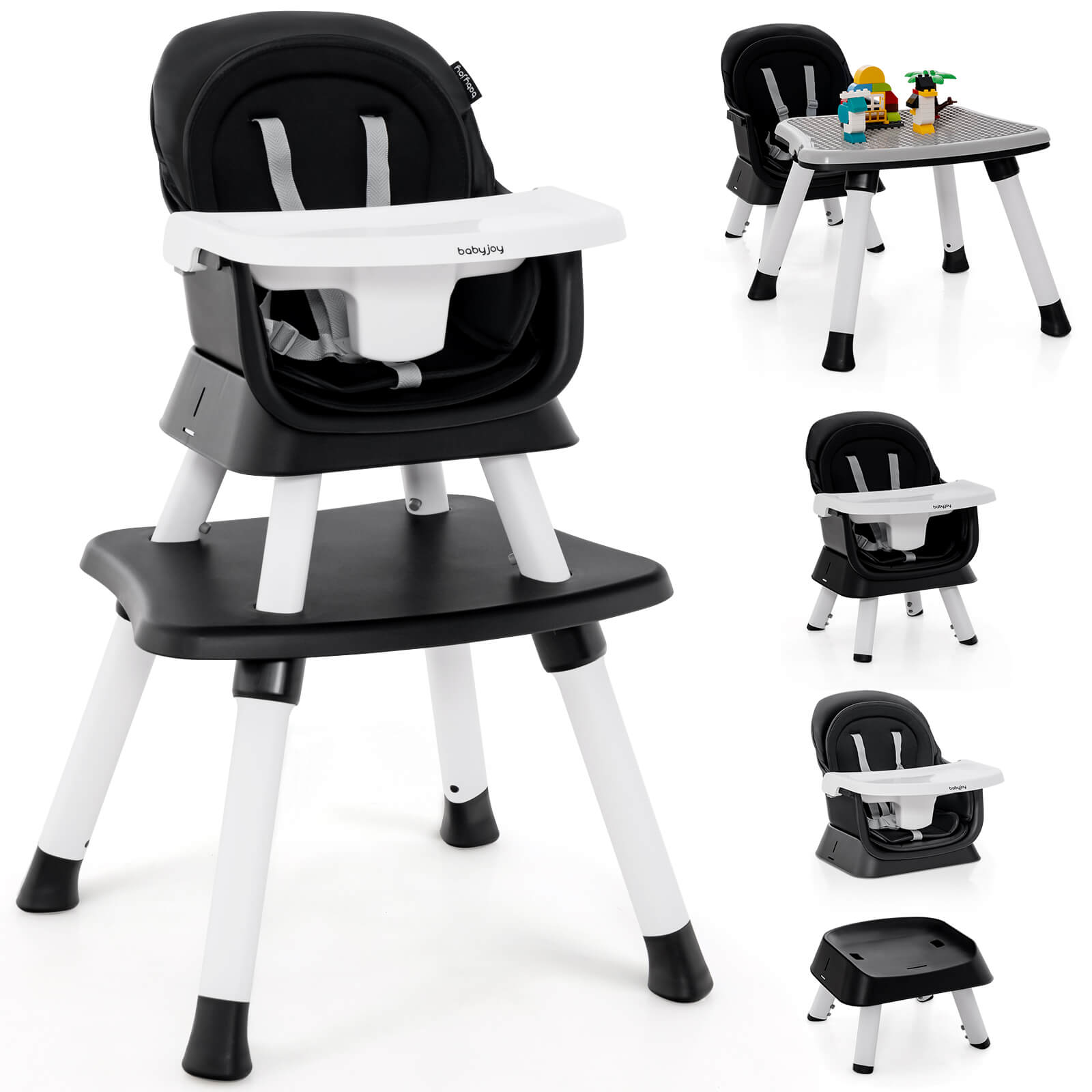 This baby high chair is made of high quality PP material, durable and strong. Layer cushions provide an upgrade in comfort. At the same time, the 5-point harness and anti-fall baffle ensure safety. All parts are machined with rounded corners and are friendly to children's delicate skin. The versatile design allows it to be used not only as a baby high chair, but also as a booster seat, children's table set and toddler stool. The double food tray can be adjusted to 3 different positions and can be washed in the washing machine.Color: Black