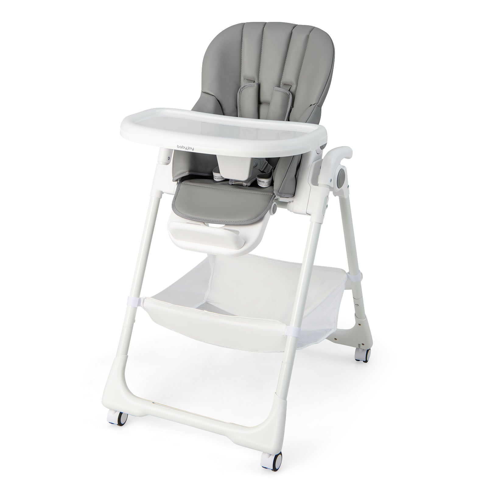 Our foldable baby high chair PU pad features an easy-to-wipe design for easy cleaning. 360?? rotating wheels allow you to easily move the baby high chair. When not in use, you can fold it for easy storage. It has adjustable height, backrest, tray and foot pedals, plus you can press down to lock the wheels when the high chair is stationary.Color: Grey