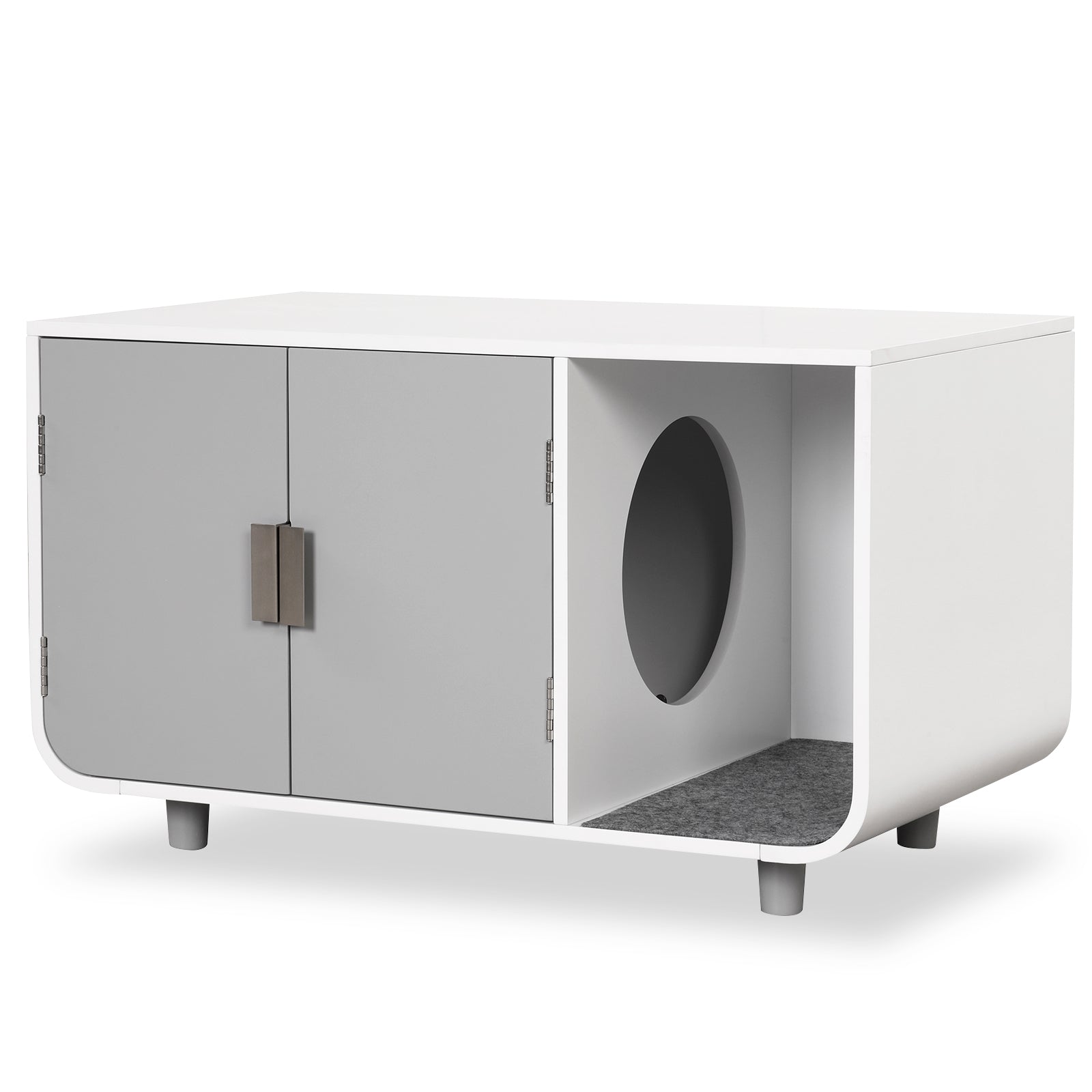 The cat house furniture is supported by rubber wood legs that can hold up to 150 pounds. And there are adjustable cushions to increase its stability. Enclosed litter box furniture comes with a double-door cabinet to hide the litter box and let your cat poop in privacy. At the same time, large cabinets and wide desktops provide plenty of space to store a variety of items, making it a good choice for a spacious side table. There is a removable mat for cleaning. So with our large litter box shell, you will no longer have to worry about clutter in your room.Color: White+Grey