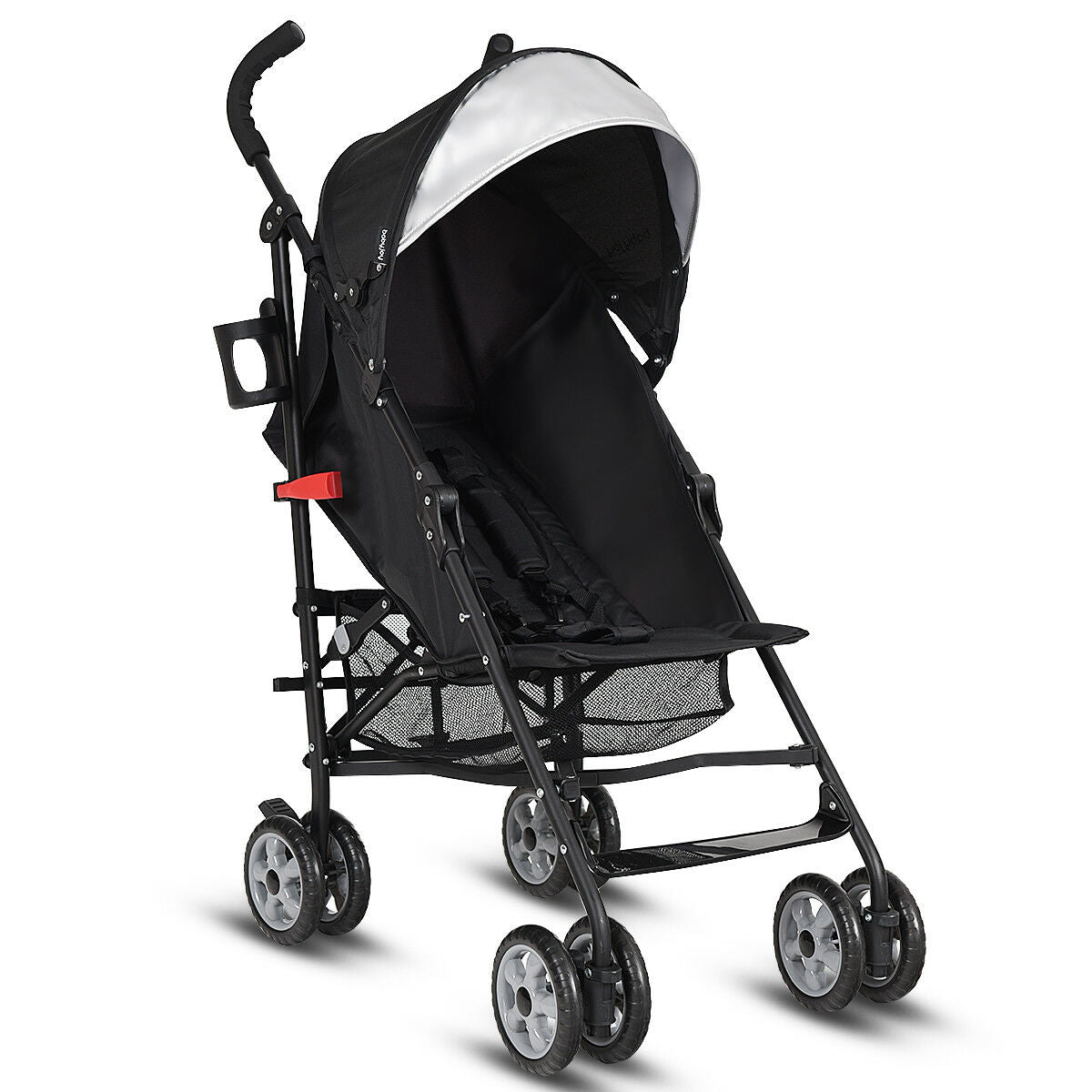 This stroller has a 5 point seatbelt shoulder strap. In addition, an adjustable awning with a flip visor will help protect your child's sensitive skin from the sun's harmful rays. The storage net basket below conveniently accommodates baby necessities, it is a durable and stable stroller with a lightweight aluminum frame and durable Oxford fabric.Color: Black