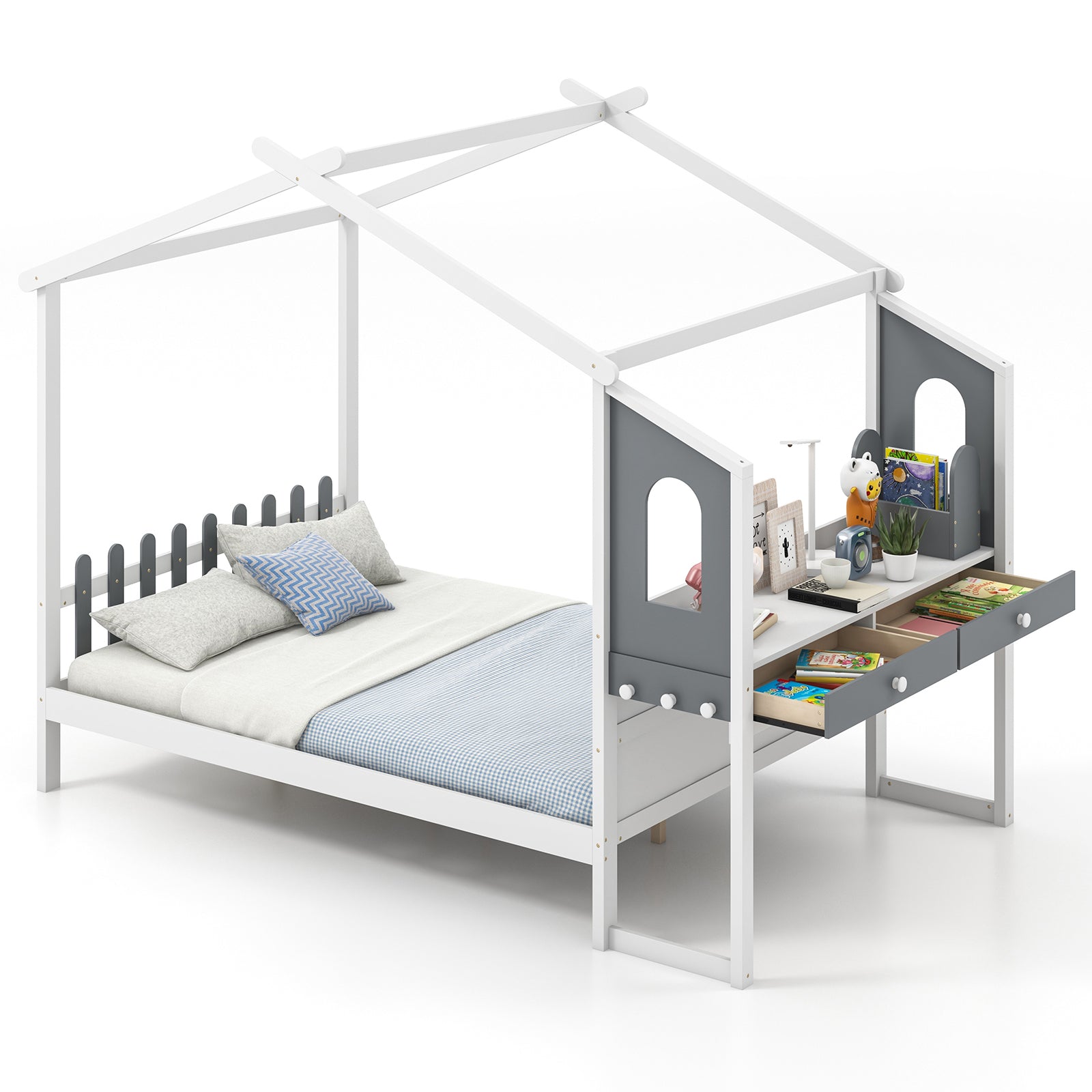 Infans Full Size Kids House Bed with Study Desk w/Removable Box Drawers Hanging Hooks