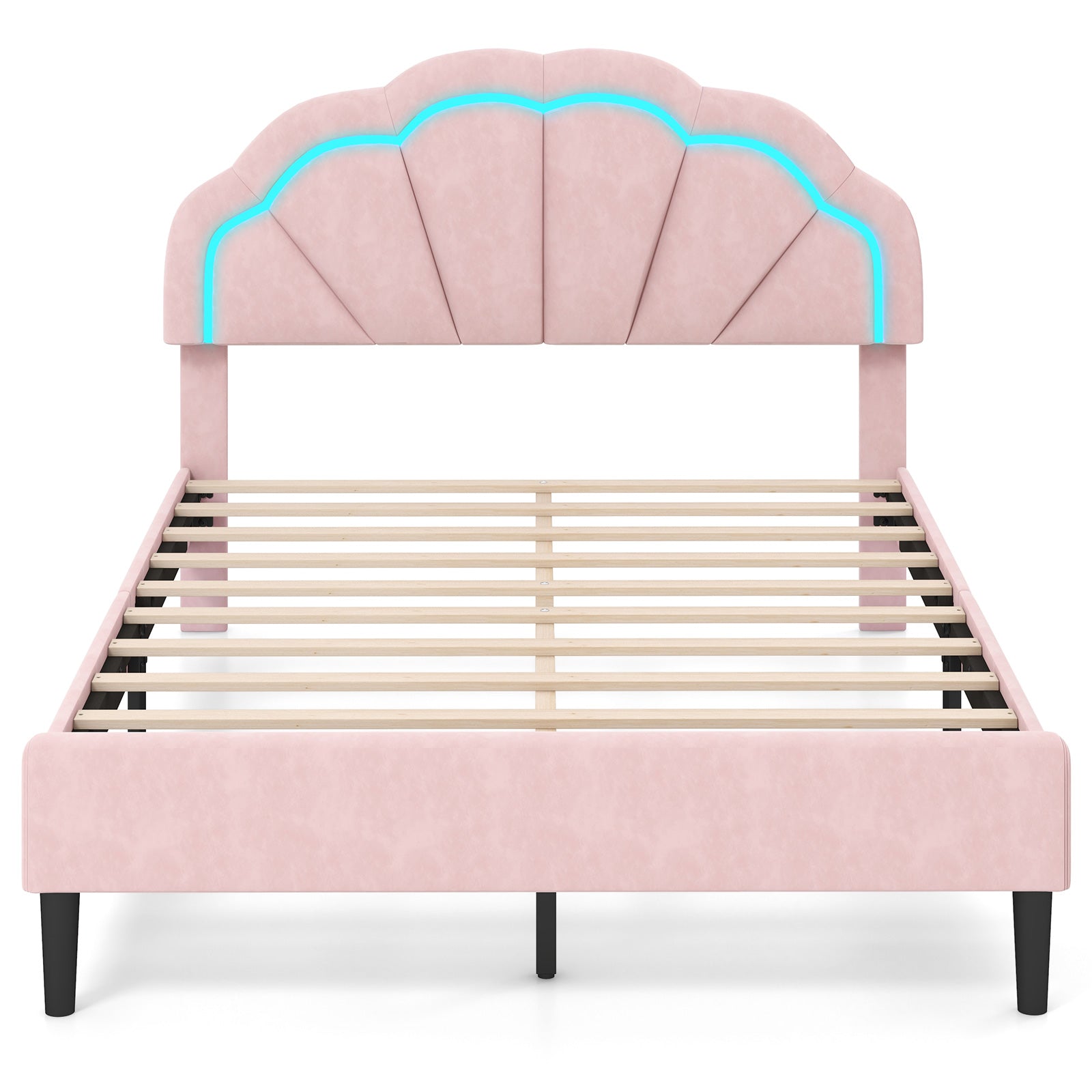 This LED bed frame is supported by sturdy wooden slats and solid wood support legs, ensuring a stable base. Thanks to the solid base, you can sleep peacefully without a spring mattress. Immerse yourself in a customized bedtime experience. With a height adjustable petal headboard, you can customize it to your liking for the best comfort and style. You can use the app and remote control to adjust light color, mode, brightness and speed for a pleasant and calm bedtime.Color: Pink