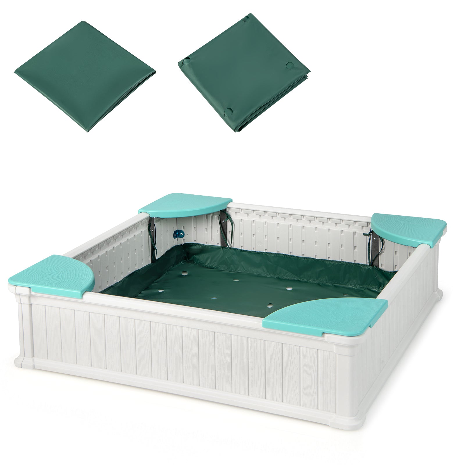 Our sandbox with lid is made of high quality HDPE material, exquisite workmanship, safe and resistant. When not in use, simply placing a weather shield over the sandbox can protect the sandpile from inclement weather, debris, mischievous pets, etc. Easily assemble the sandbox in a short time, then you can secure the backing and fill the sandbox with sand. When tired, the children can have a rest in the corner seat. It offers a large play area for children to indulge in for hours.Color: White