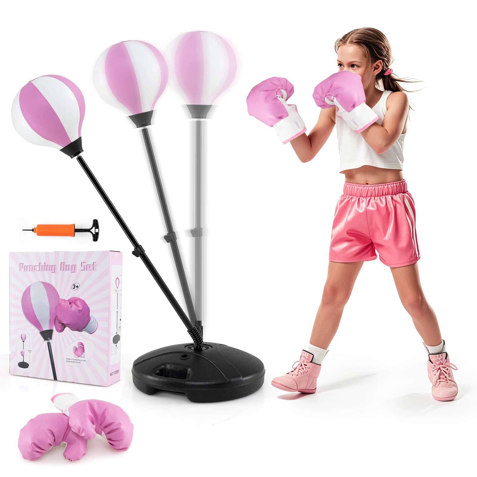 This complete boxing set is the ideal gift choice to promote children's hand-eye coordination and overall health, packaged in a beautiful gift box for special occasions. This complete boxing set is the ideal gift choice to promote children's hand-eye coordination and overall health, packaged in a beautiful gift box for special occasions. The rotary knob is designed to freely adjust the height, ranging from 32 "to 48.5", ensuring that it can grow with children. The stable weighted base can be filled with sand or water to prevent tipping over during use.Color: Pink & White