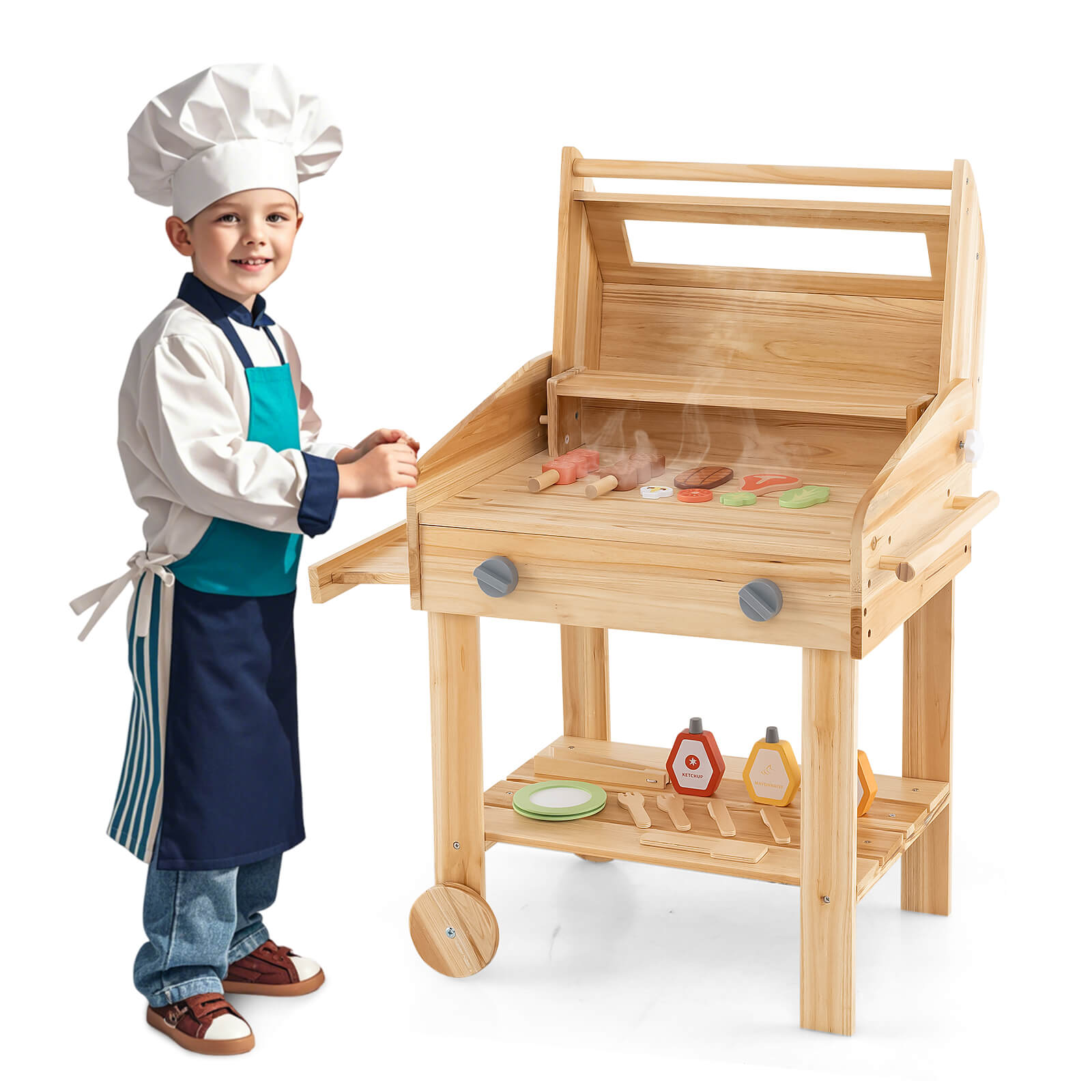 Perfect for children over 3 years old, this children's mock kitchen set features a sturdy wooden construction with 2 wheels and side handles for easy movement, ensuring a safe barbecue experience indoors or outdoors. The thoughtful design includes plenty of storage space with a slide-out tray, seasoning rack and undershelf to keep cooking essentials organized. It comes with a wealth of accessories, including barbecue tools, barbecue forks, seasoning bottles and a variety of toy foods to enrich the simulation game. This wooden toy BBQ toy is perfect as a gift that not only brings fun, but also helps develop basic life skills that make every mock BBQ a learning adventure.Color: Natural